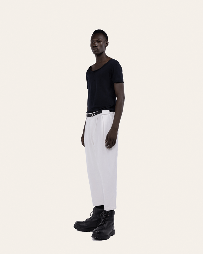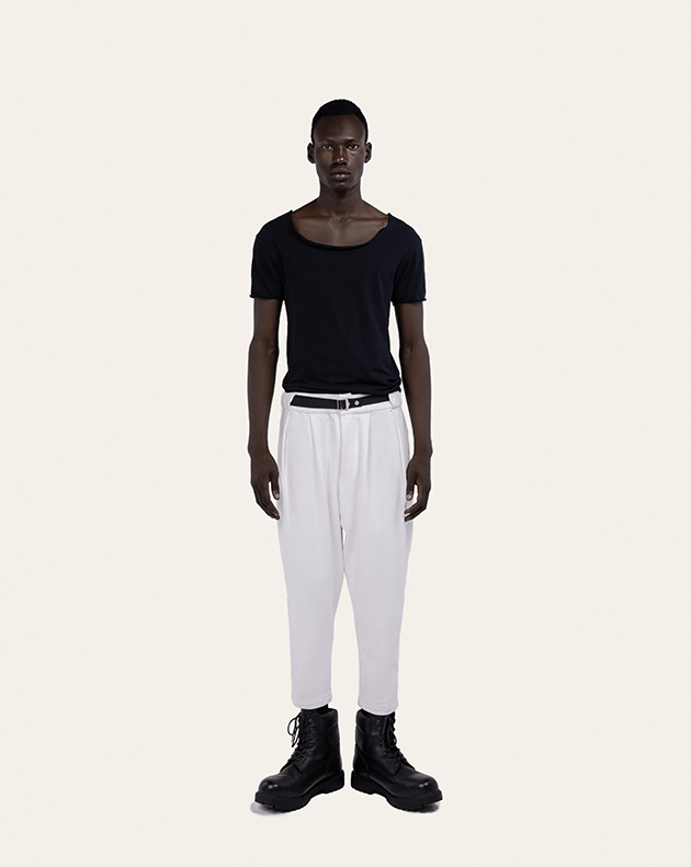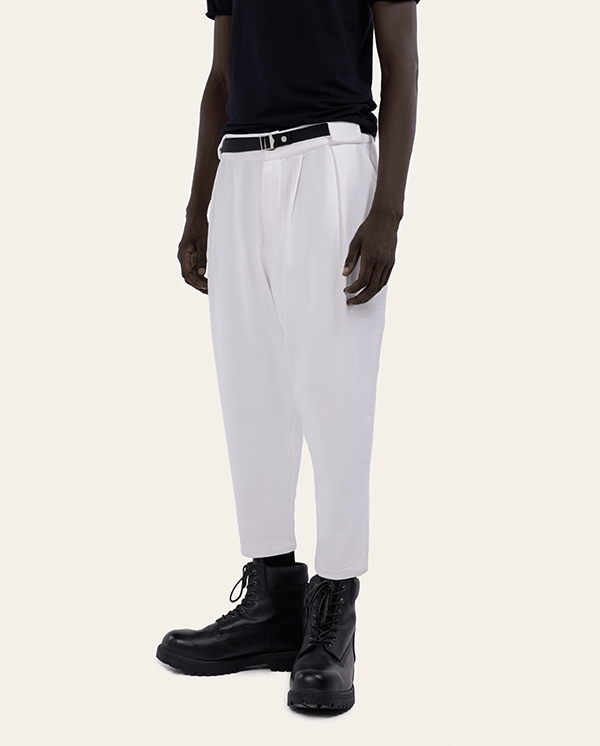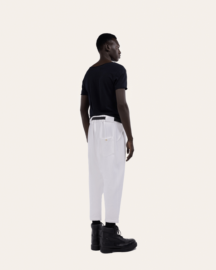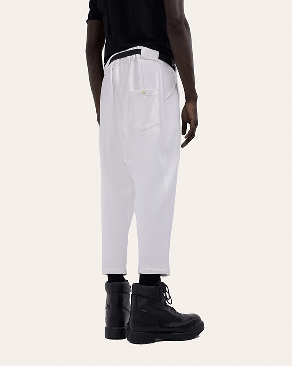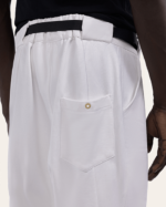 These pants are made of 100% Egyptian pure cotton, with a dense yet supple hand for fluid tailoring. They shows the fit that distinguishes the Waseem khadra style,, Their classic details include pleats that extend into pressed creases, slanted side pockets and elasticband on the back to adjust the waist.