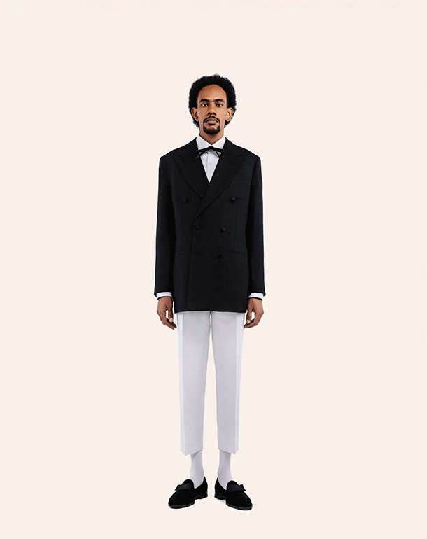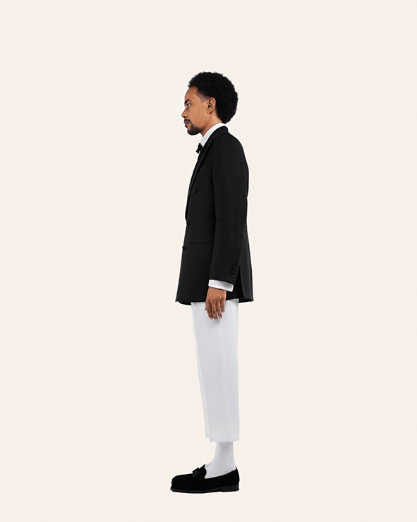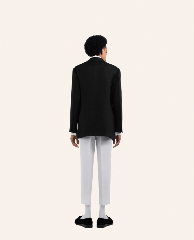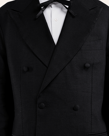 This double breasted tuxedo blazer made from wool silk linen , peak lapel with six buttons front, regular fit, interior chest pockets.